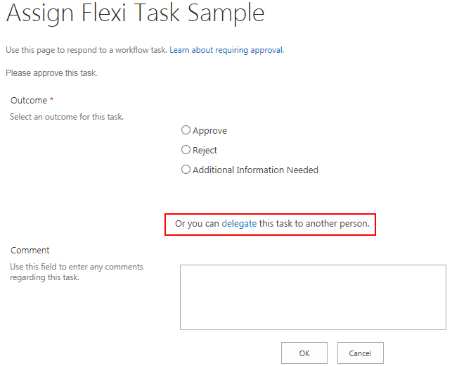 All task actions have the option for you to Allow delegation when you are configuring the action. When this option is selected, the assignee will see a link on the task form that allows them to delegate the task to another user.