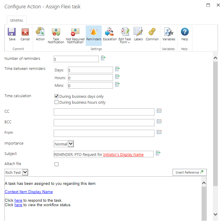 Several actions have reminder and escalation capability built in. The reminder capability allows you to configure additional emails to be sent to task assignees if a certain amount of time has passed and the task has not been completed.