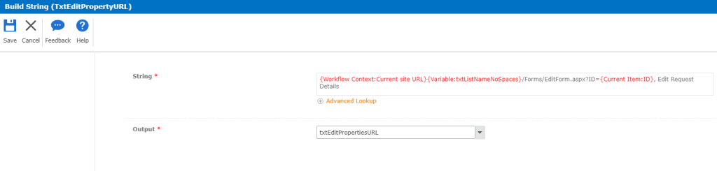 - String: {Workflow Context:Current site URL}{Variable:txtListNameNoSpaces}/Forms/EditForm.aspx?ID={Current Item:ID}, Edit Request Details