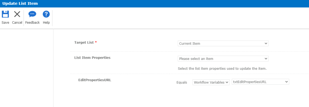 - EditPropertiesURL: Equals Workflow Variables: txtEditPropertiesURL