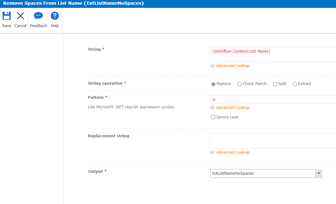 Action 1 – Regular Expression: Remove spaces from List Name