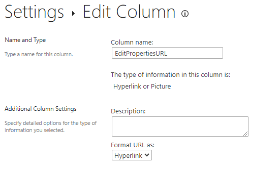 Step 1 – Add Hyperlink list column called EditPropertiesURL